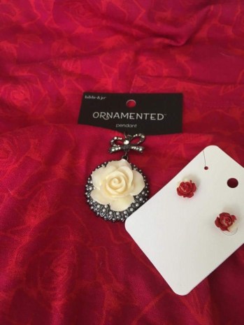The outfits included a Merida-inspired blue-green dress with a belt, Etsy-commissioned pendant, and arrow earrings; a “painting the roses red” ensemble inspired by “Alice in Wonderland” that included a red dress, white rose necklace, and paint-speckled earrings; and a smoky purple dress and skeleton cameo earrings that evoked Disney’s Haunted Mansion.