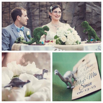 Our centerpieces were dinosaur topiaries (made from scratch), there were dinosaurs in my bouquet, as well as the boutonnières. Our musician played the “Jurassic Park” theme song as we walked down the aisle after we were wed. Our photographer made some amazing shots with dinos cause he knew my love for them.
