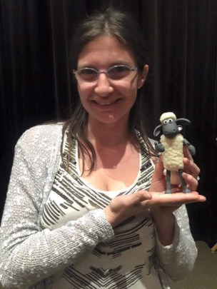 Christine with a maquette of Shaun the Sheep at an ASIFA event.