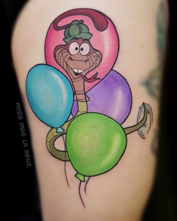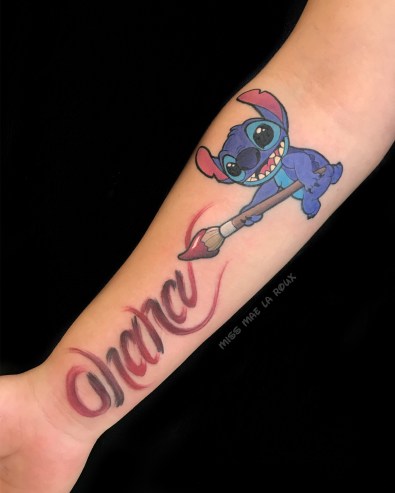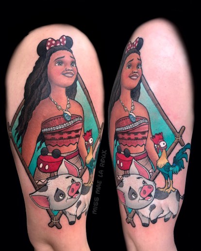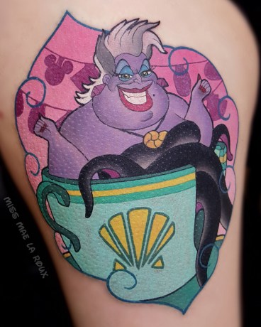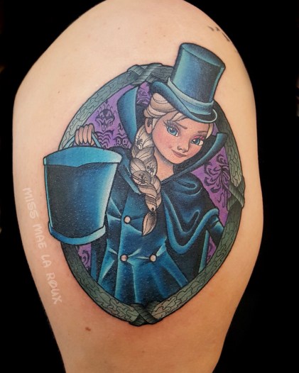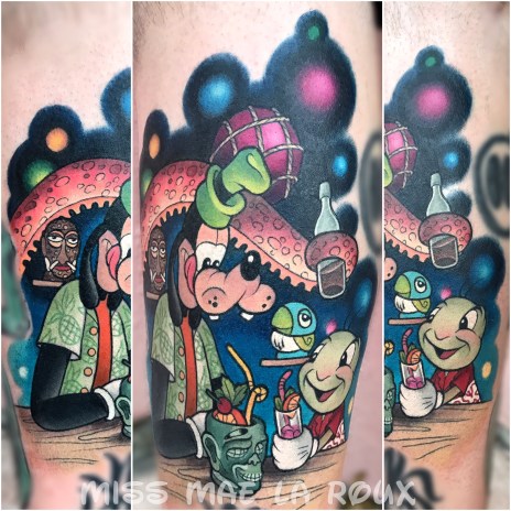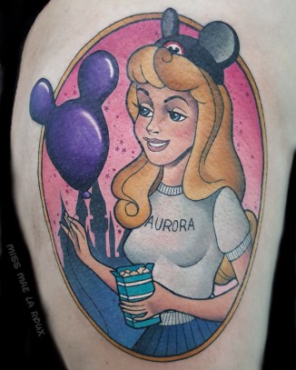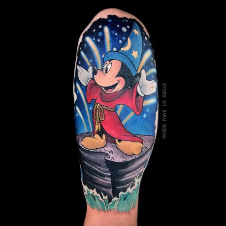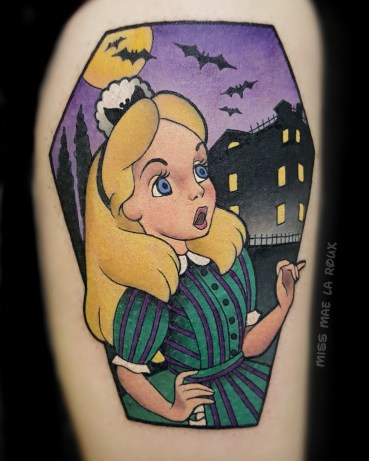 After a trip to Disneyland helped her reclaim her lost childhood, Miss Mae decided to devote herself to doing what she loves, specializing almost exclusively in Disney-inspired tattoos, with occasional exceptions to the rule. She views her art as a joyful service, bringing “positivity” to people’s lives.