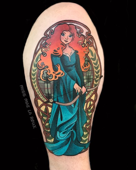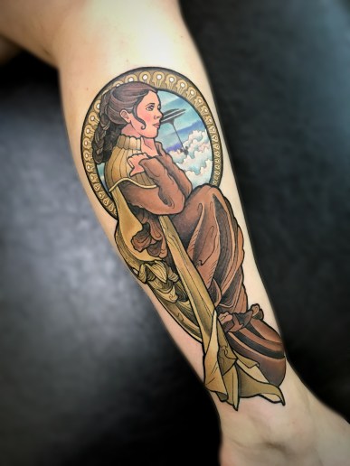I don’t think there’s a particular tattoo genre to describe what I do. I was taught traditional styles but my realism and fine art background melded into its own creature. Art Nouveau artist Alphonse Mucha is a huge influence on my style in linework and shading. I would say “Sleeping Beauty” artist Eyvind Earle is my main inspiration as far as Disney artists are concerned on a conceptual level.