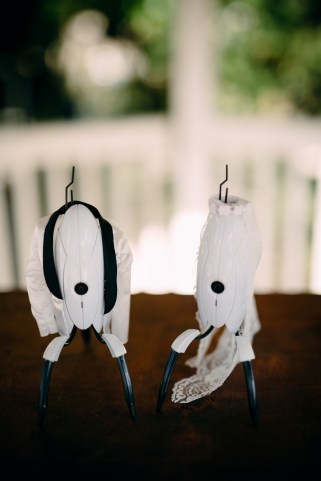 Yes! We’ve done a few. My most proud geeky DIY was our cake toppers for our wedding. We didn’t come up with this ourselves, but we saw on Reddit that someone had turned two turrets (from Portal) into a bride and groom turret. I remember when Todd and I found it, we both turned to each other and I’m pretty sure the first thing we said was, “Our parents are going to hate this.” But we did it and it was so wonderful and our families were so confused.