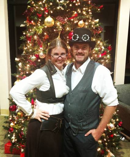 R.J. Metcalf and husband Mike indulge in some steampunk cosplay for a Christmas dinner at their church.