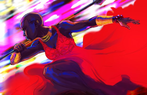 Your website features art inspired by Marvel, Fantastic Beasts and Where to Find Them, Final Fantasy XV, Hetalia: Axis Powers, Disney, Game of Thrones, and Star Wars. One of my favorites is your illustration of Okoye from Black Panther. It’s very powerful. Tell me about your thought process in creating that piece.