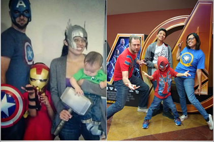 Monica and her family, at left, ready for the Avengers movie in 2012, and at the theater for Avengers: Infinity War in 2018.