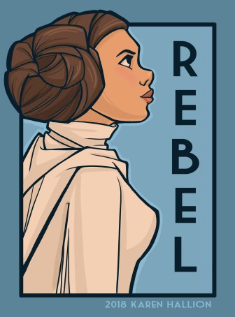 I had the idea to do an “empowering women” series for a while but I didn’t know what that was going to be. It was scribbled on my white board of ideas for almost a year. I did the Leia piece first, with the word “Rebel,” and I did her in profile because I wanted to practice my profile skills and I really liked that image of her looking up defiantly.