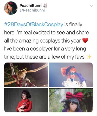 #28DaysofBlackCosplay was created five years ago by cosplayer Chaka Cumberbatch-Tinsley, aka @princessology. In an article for Essence by Briana Lawrence, the hashtag creator said #28Days is about “visiblity, representation and celebration.”