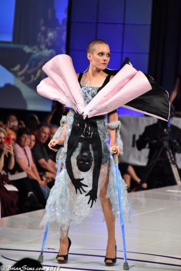 Also, it was important to me to cast a model with a disability because of the under-representation of the disabled in fashion. My Eleven was a wonderful model named Katie Fleck who has Elhers-Danlos syndrome, a joint disorder. We made sure to incorporate her crutches into the design, which I think was very successful.