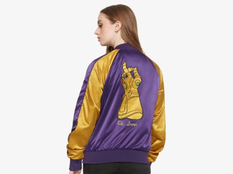 Earlier this year, Her Universe debuted its Marvel collection, inspired by Avengers: Endgame. You designed two of the pieces, the Thanos Oh Snap Bomber Jacket and a Nebula-inspired sports bra and shorts. This was a collaborative effort, right? What did the design process entail?
