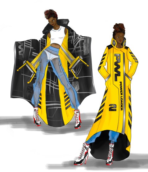 So many people start thinking about designs for the show super early, and I’ve always had an ongoing list of things I could mine for ideas. The Power Loader is such a memorable piece of movie history, as well as a very graphic image that translates over into my style of fashion super well. I wanted to go as high fashion as possible, so doing an oversized trench coat really fit into that narrative. The graphic text and imagery around the concept also just felt really “me.”