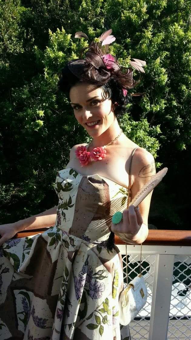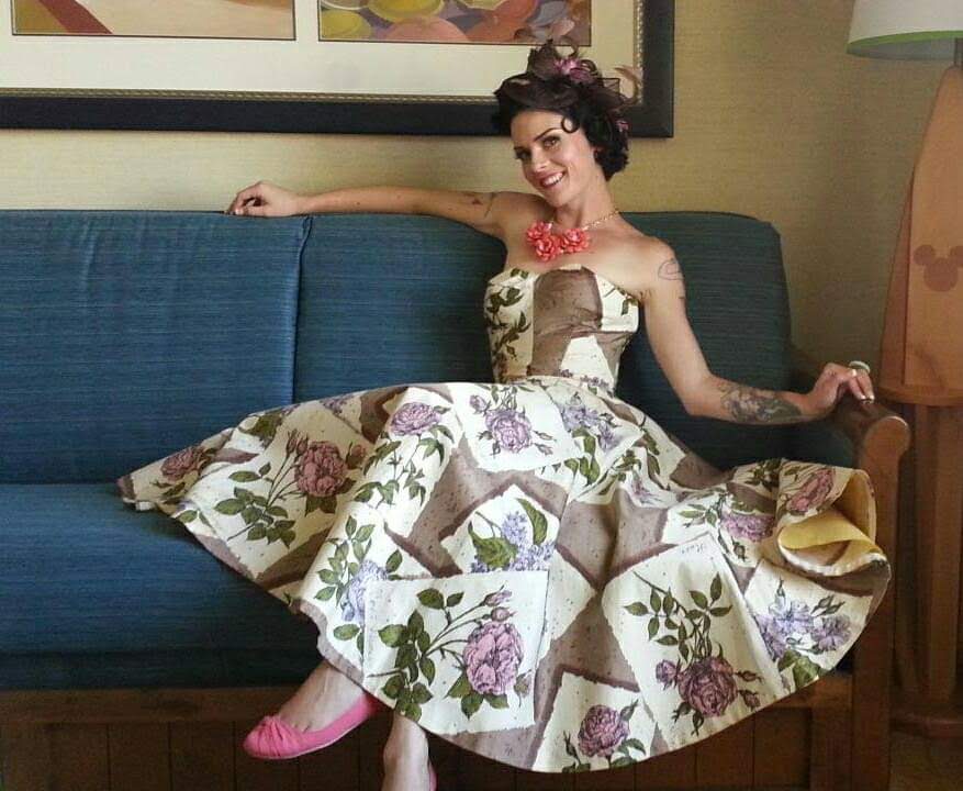 In fall 2013, Coe wore a stunning 1950s dress with a flower stamp print, inspired by the “Golden Afternoon” of Disney’s animated Alice in Wonderland. That look was featured in the OC Register.