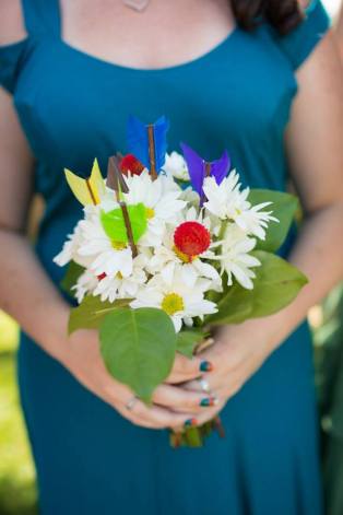 A bridesmaid carries a “Brave”-themed bouquet.