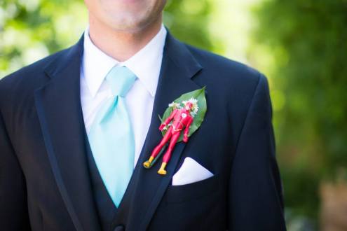 The men all had action figures for their boutonnieres, and a matching shirt with their superhero’s logo under their suits. Our ring bearer was Thor and the pillow with the rings was shaped like Thor’s hammer.